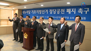 °æ±âµµ ½Ã±ºÀÇȸ ÀÇÀåÇùÀÇȸ ¹ÎÁÖ´ç ¼Ò¼Ó ÀÇÀåµéÀÌ 13ÀÏ ¼ö¿ø½ÃÀÇȸ ¼¼¹Ì³ª½Ç¿¡¼ ±âÀÚȸ°ßÀ» °®°í, "»õ´©¸®´çÀº ±âÃʼ±°Å Á¤´ç°øÃµÁ¦¸¦ Áï°¢ ÆóÁöÇ϶ó"°í Ã˱¸Çß´Ù.