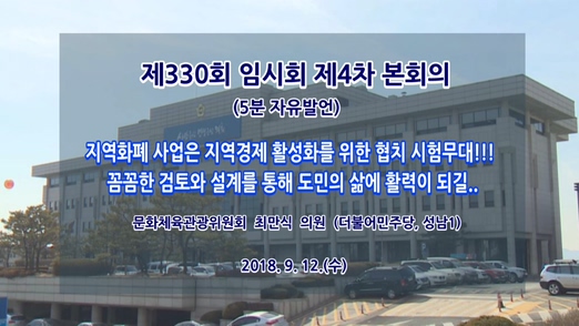 °æ±âµµÀÇȸ Á¦330ȸ ÀÓ½Ãȸ Á¦4Â÷ º»È¸ÀÇ [5ºÐÀÚÀ¯¹ß¾ð] ¹®ÈüÀ°°ü±¤À§¿øÈ¸ ÃÖ¸¸½Ä ÀÇ¿ø - Áö¿ªÈÆó »ç¾÷Àº Áö¿ª°æÁ¦ Ȱ¼ºÈ¸¦ À§ÇÑ ÇùÄ¡ ½ÃÇ蹫´ë!!! |
