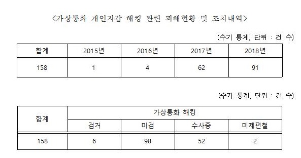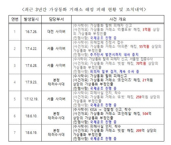 °æÂûûÀÌ Á¦ÃâÇÑ ÀÚ·á¿¡ ÀÇÇÏ¸é °¡»óÅëÈ­ °Å·¡¼Ò¿¡ ´ëÇÑ ÇØÅ·À» ÅëÇØ µµ³­´çÇÑ °¡»óÅëÈ­ ±Ý¾×ÀÌ ¸Å³â ²ÙÁØÈ÷ Áõ°¡ÇÏ´Â °ÍÀ¸·Î ³ªÅ¸³µÀ¸¸ç 2016³â 1°Ç 3¾ï¿ø¿¡ ºÒ°úÇß´ø ºÎÁ¤ÀÎÃ⠱ݾ×Àº 2017³â¿¡´Â 4°Ç 405¾ï¿øÀ¸·Î ´Ã¾î³µ°í 2018³â¿¡´Â 2°ÇÀÇ ÇØÅ·»ç°ÇÀÌ ¹ß»ýÇߴµ¥ ºÎÁ¤À¸·Î ÀÎÃâ´çÇØ µµ³­´çÇÑ ±Ý¾×ÀÌ 713¾ï¿ø¿¡ ´ÞÇß´Ù.