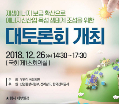 ´õºÒ¾î¹ÎÁÖ´ç ¿ì¿ø½Ä ÀÇ¿ø(¼¿ï ³ë¿ø±¸À»)Àº 26ÀÏ(¼ö) ¿ÀÈÄ 2½Ã30ºÐ ±¹È¸ ÀÇ¿øÈ¸°ü Á¦1¼ÒȸÀǽǿ¡¼ »ê¾÷Åë»óÀÚ¿øºÎ, Àü¶ó³²µµ, Çѱ¹Àü·Â°ø»ç¿Í ÇÔ²² <Àç»ý¿¡³ÊÁö º¸±Þ È®»êÀ¸·Î ¿¡³ÊÁö½Å»ê¾÷ À°¼º »ýŰè Á¶¼ºÀ» À§ÇÑ ´ëÅä·Ðȸ>¸¦ °³ÃÖÇÑ´Ù. ¿ì¿ø½ÄÀÇ¿ø, ±è¿µ·Ï Àü³²µµÁö»ç, Á¤½ÂÀÏ »êÀںΠÂ÷°ü, ±èÁ¾°© ÇÑÀü »çÀå µî Á¤ºÎ, ÁöÀÚü, ½Ã¹Î µî 100¿© ¸í ÀÌ»óÀÌ Âü¼®ÇÒ ¿¹Á¤ÀÌ´Ù.