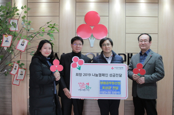 ´ëÀü½Ã Á¤º¸È´ã´ç°ü½Ç ¾çâ±¹(47) ÁÖ¹«°üÀº Áö³ ´Þ 31ÀÏ Ã»·Å°ø¹«¿øÀ¸·Î ¼±Á¤µÅ ǥâÀå°ú ÇÔ²² ¹ÞÀº »ó±Ý 100¸¸¿ø Àü¾×À» ºÒ¿ìÀÌ¿ôµ½±â ¼º±ÝÀ¸·Î ±âºÎÇß´Ù.