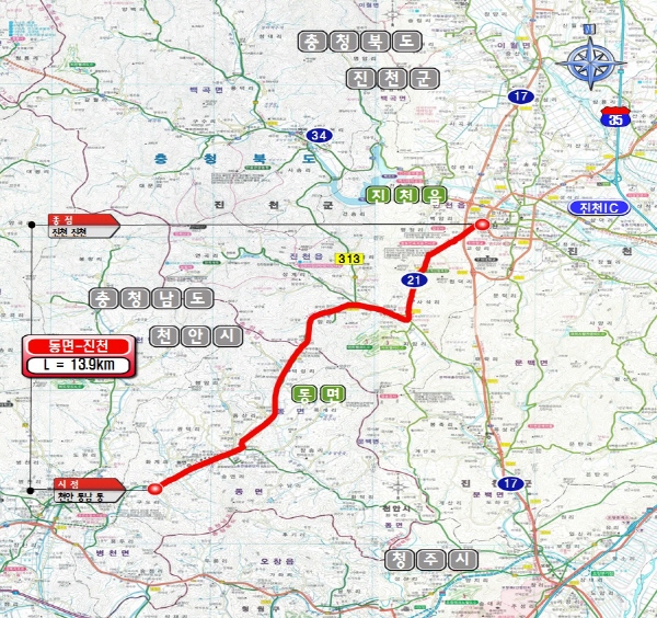 ±¹µµ21È£¼±(õ¾È~ÁøÃµ) È®Àå»ç¾÷Àº ÃßÁ¤»ç¾÷ºñ 1994¾ï¿øÀ» ÅõÀÔÇØ µ¿³²±¸ µ¿¸é ±¸µµ¸®¿¡¼ ÃæºÏ ÁøÃµ±º ÁøÃµÀ¾ À¾³»¸® ±¸°£ 13.9§°¸¦ 2Â÷·Î¿¡¼ 4Â÷·Î·Î È®ÀåÇÏ´Â »ç¾÷ÀÌ´Ù. õ¾È¿¡ Æ÷ÇÔµÈ ±¸°£Àº µ¿¸é ±¸µµ¸®¿¡¼ ´ö¼º¸® ±¸°£ 4.9km·Î »ç¾÷ºñ ¾à 680¾ï¿øÀÌ µé¾î°¥ Àü¸ÁÀÌ´Ù.