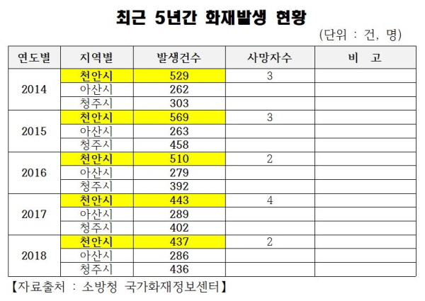 22ÀÏ Ãµ¾È½Ã¿¡ µû¸£¸é ÃÖ±Ù 5³â°£ ÈÀçÅë°è¸¦ ºÐ¼®ÇÑ °á°ú Áö³ÇØ Ãµ¾È¿¡¼ ÃÑ 437°ÇÀÇ ÈÀç°¡ ¹ß»ýÇßÀ¸¸ç, 2017³â¿¡´Â 443°Ç, 2016³â 510°Ç, 2015³â 569°Ç, 2014³â 529°ÇÀ¸·Î ÈÀç¹ß»ý°Ç¼ö°¡ Áö¼ÓÇØ¼ °¨¼ÒÇß´Ù.