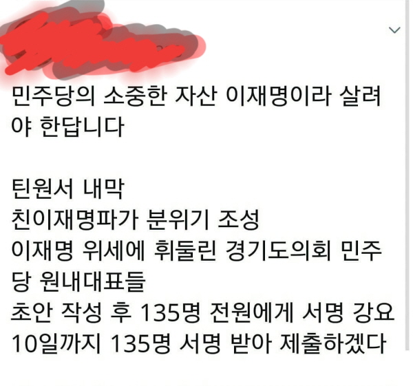 ¶Ç ´Ù¸¥ ´©¸®²ÛÀº Ä£ÀÌÀç¸íÆÄ°¡ ºÐÀ§±â¸¦ Á¶¼ºÇØ ÀÌÁö»çÀÇ À§¼¼¿¡ ÈֵѸ° °æ±âµµÀÇȸ ¹ÎÁÖ´ç ¿ø³»´ëÇ¥µéÀÌ ÃʾÈÀ» ÀÛ¼ºÇÑ ÈÄ 135¸í Àü¿ø¿¡°Ô ¼¸íÀ» °¿äÇϰí ÀÖ´Ù°íµµ ÁÖÀåÇß´Ù.