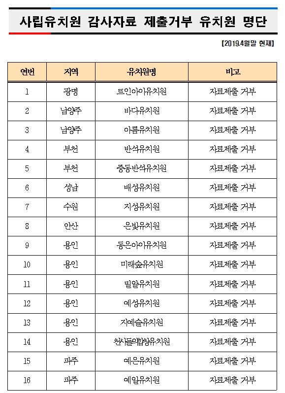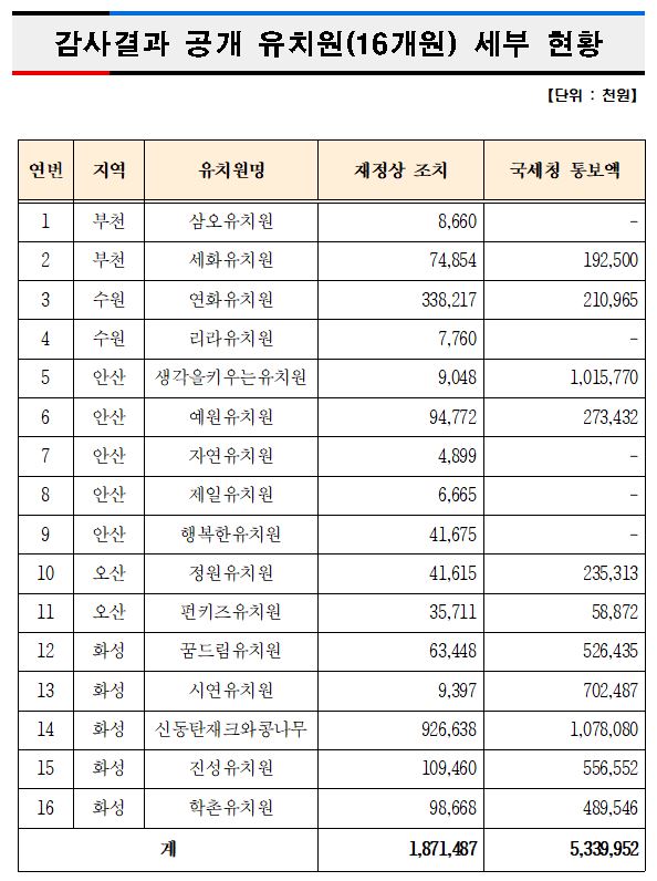 °æ±âµµ±³À°Ã»(±³À°°¨ ÀÌÀçÁ¤)ÀÌ 1¿ùºÎÅÍ 4¿ù±îÁö 57°³ »ç¸³À¯Ä¡¿ø¿¡ ´ëÇÑ Àü¼ö°¨»ç¸¦ ¿Ï·áÇϰí óºÐÀÌ È®Á¤µÈ 16°³ À¯Ä¡¿ø ¸í´ÜÀ» ȨÆäÀÌÁö¿¡ °ø°³Çß´Ù.