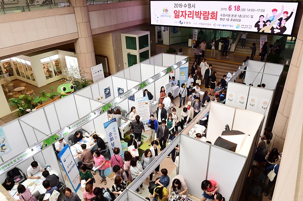 ¿°Å¿µ ½ÃÀåÀ» ºñ·ÔÇÑ ÆÐ³ÎµéÀº ÅäÅ©ÄܼƮ ÈÄ ¼ö¿ø½Ãû º»°ü ·Îºñ¡¤ÁßȸÀǽǿ¡¼ ¿¸° ¡®2019 ¼ö¿ø½Ã ÀÏÀÚ¸®¹Ú¶÷ȸ¡¯ ÇöÀåÀ» ã¾Ò´Ù. 50°³ Áß¼Ò¡¤Áß°ß±â¾÷ÀÌ Âü¿©ÇÑ À̹ø ÀÏÀÚ¸®¹Ú¶÷ȸ¿¡´Â 1700¿© ¸íÀÇ ±¸Á÷ÀÚ°¡ ¸ô·Á ¼ºÈ²À» ÀÌ·ð´Ù. Âü¿© ±â¾÷µéÀº ÇöÀå¿¡¼ ±¸Á÷ÀÚ ¸éÁ¢À» Çϰí 250¿© ¸íÀ» ä¿ëÇÒ ¿¹Á¤ÀÌ´Ù.