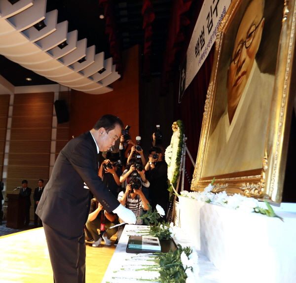 ÀÌ ÀÚ¸®¿¡¼ ¹® ÀÇÀåÀº ¡°¹é¹ü ¼±»ý²²¼´Â ¡®³»°¡ ¿øÇÏ´Â ¿ì¸®³ª¶ó¡¯¸¦ ÅëÇØ ¼±»ýÀÌ ¼Ò¸ÁÇÏ´Â ³ª¶ó´Â ±º»ç ´ë±¹µµ °æÁ¦ ´ë±¹µµ ¾Æ´Ñ ¹®È ´ë±¹À̶ó°í Çϼ̴١± ¸é¼ ¡°Áö±Ý ´ëÇѹα¹Àº ±º»ç °±¹Àº ¹°·ÐÀÌ¸ç ¿µÈ¿Í ´ëÁßÀ½¾Ç µî ÇÑ·ù¹®È°¡ Àü ¼¼°è¸¦ ÈÛ¾²´Â ¹®È´ë±¹ÀÌ µÇ¾ú´Ù. ¹é¹ü ±è±¸ ¼±»ýÀ» ºñ·ÔÇÑ ¼±Á¶µé ¾Õ¿¡ ÀÚ¶û½º·¯¿î Á¶±¹À» ¸¸µé¾î °¡°í ÀÖ´Ù¡±°í ¸»Çß´Ù.