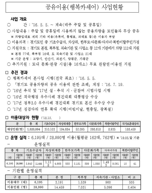 Çູī¼Î¾î´Â ÁÖ¸»À̳ª °øÈÞÀÏ µî¿¡ ¿îÇàÇÏÁö ¾Ê´Â °æ±âµµ °ø¿ëÂ÷·®À» µµ¹Î¿¡°Ô ¹«»óÀ¸·Î ºô·ÁÁÖ´Â »ç¾÷ÀÌ´Ù. 2016³â 5¿ùºÎÅÍ °æ±âµµ°¡ Àü±¹ ÃÖÃÊ·Î ½ÃÇàÇϰí ÀÖ´Ù. ¿ÃÇØ 5¿ù ±âÁØÀ¸·Î 3³â µ¿¾È ÃÑ 28,990¸í¿¡°Ô 6,195´ëÀÇ Â÷·®À» Á¦°øÇß´Ù.