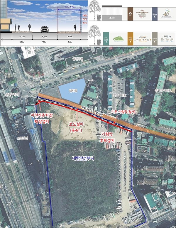 À̹ø °ø»ç´Â ±Ýõ±¸Ã»¿ª ¾Õ¿¡¼ ÇÊ½Â¾ÆÆÄÆ® ºÎ±Ù±îÁö ½ÃÈï´ë·Î63±æ°ú Á¢ÇÑ ±¸(ÏÁ)´ëÇÑÀü¼±ºÎÁö ¾à 200m±¸°£À» ´ë»óÀ¸·Î ÇÑ´Ù. ±âÁ¸ ³ëÈÄ °¡¸²¸·À» ö°ÅÇÑ ÈÄ Æø4mÀÇ º¸µµ¸¦ ½Å¼³ÇÑ´Ù. º¸µµÁ¶¼º¿¡ µû¶ó ÈÄÅ𠼳ġµÇ´Â °¡¸²¸·¿¡´Â ±Ýõ±¸¸¦ »ó¡ÇÏ´Â °ø°øµðÀÚÀÎÀ» Àû¿ëÇÑ´Ù.
