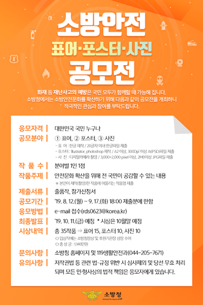 °ø¸ð±â°£Àº 8¿ù 12ÀϺÎÅÍ 9¿ù 17ÀϱîÁöÀ̸ç, ÁöÁ¤µÈ ¾ç½Ä¿¡ µû¶ó Á¦ÀÛµÈ ÀÛǰÀ» ¼Ò¹æÃ» 119»ýȰ¾ÈÀü°ú e-mail rds0623i@korea.kr·Î Á¢¼öÇÏ¸é µÈ´Ù.