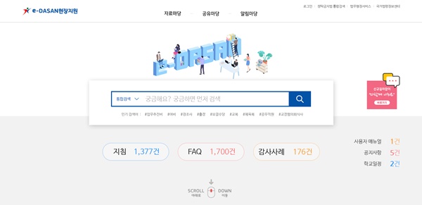 ¡®e-DASANÇöÀåÁö¿ø¡¯Àº Çб³ ÇöÀå¾÷¹«(±³¹«Çлç, ÇàÁ¤/ÀÏ¹Ý ºÐ¾ß)¿¡ ´ëÇÑ ±Ã±ÝÁõÀ» ¸ÂÃãÇüÀ¸·Î Áö¿øÇØ ÇàÁ¤¾÷¹« °æ°¨°ú Çб³ ÀÚÀ²°æ¿µÀ» µ½´Â ¿Â¶óÀÎ ½Ã½ºÅÛÀ¸·Î µµ±³À°Ã»Àº Áö±Ý±îÁö Áú¹®´äº¯(FAQ)À» Á¦¿ÜÇÑ ¾÷¹«Áöħ°ú °¨»ç»ç·Ê¸¦ ÀϹݿ¡ °ø°³ÇؿԴÙ.
