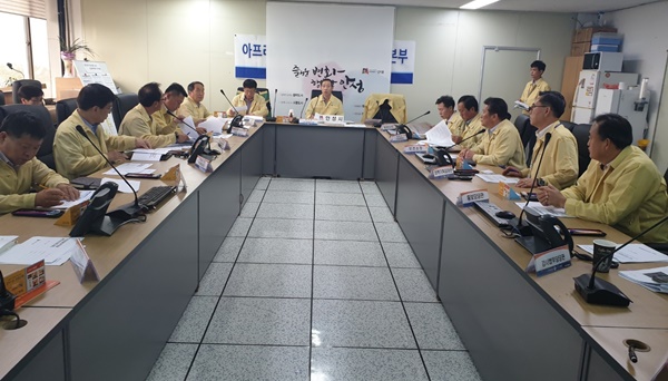 ¾È¼º½Ã°¡ Áö³ 1ÀÏ ½Ãû Àç³Á¾ÇÕ»óȲ½Ç¿¡¼ Çѹݵµ¸¦ ÇâÇØ ºÏ»óÇϰí ÀÖ´Â Á¦18È£ ÅÂdz ¡®¹ÌŹ¡¯ ¹× ASF(¾ÆÇÁ¸®Ä« µÅÁö¿º´)¿¡ ´ëºñÇÏ¿© ¡®»óȲÆÇ´ÜȸÀÇ¡¯¸¦ °³ÃÖÇß´Ù.