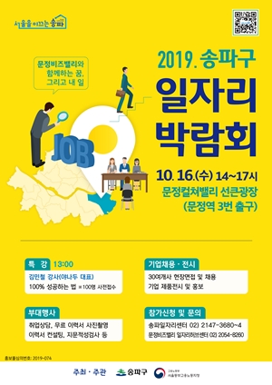 ¼ÛÆÄ±¸(±¸Ã»Àå ¹Ú¼º¼ö)°¡ 10¿ù 16ÀÏ, Ãë¾÷ÄÁ¼³ÆÃºÎÅÍ Ã¤¿ë±îÁö ÇÑ ÀÚ¸®¿¡¼­ °¡´ÉÇÑ ¡®2019 ¼ÛÆÄ±¸ ÀÏÀÚ¸®¹Ú¶÷ȸ¡¯°¡ ¹®Á¤ºñÁî¹ë¸® ¼±Å«±¤Àå(¹®Á¤¿ª 3, 4¹ø Ãⱸ ¾Õ)¿¡¼­ ¿ÀÈÄ 2½Ã~5½Ã±îÁö ¿­¸°´Ù.