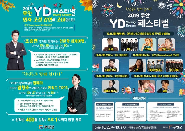 2019 ¹«¾È ¿µµå¸²(Young Dream) Æä½ºÆ¼¹úÀÌ ¿À´Â 10¿ù 25ÀϺÎÅÍ 27ÀϱîÁö ¹«¾È±º »ïÇâÀ¾ ³²¾Ç½Åµµ½Ã Áß¾Ó°ø¿ø ÀÏ¿ø¿¡¼­ °³ÃֵȴÙ.