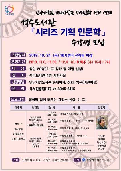 ¾È¾ç ½Ã¼®¼öµµ¼°üÀÌ ¡®¸íÈ¿Í ÇÔ²² ¹è¿ì´Â ±×¸®½º ½ÅÈ¡¯ µî ¸íÀÛ°Á Äڳʸ¦ °³¼³, 24ÀϺÎÅÍ ¼ö°½ÅûÀ» ¹Þ´Â´Ù.