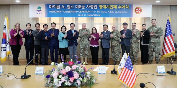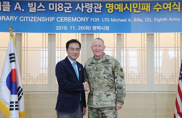ÀÌ¿¡ Á¤Àå¼± ½ÃÀåÀº ¡°ºô½º »ç·É°üÀº 77³â ÆòÅÿ¡¼­ ±º »ýȰÀ» ½ÃÀÛÇØ ÆòÅÿ¡¼­ ¸¶¹«¸®ÇÒ °èȹÀ¸·Î ¾Ë°í ÀÖ´Ù¡±¸ç, ¡°6.25 ÂüÀü ¿ë»çÀ̽ŠºÎÄ£¿¡ À̾î 2´ë¿¡ °ÉÃÄ Çѱ¹°ú ¶æ±íÀº Àο¬À» ¸Î°í Áö¿ª»çȸ¿ÍÀÇ È­ÇÕ°ú Çѹ̰ü°è °­È­¿¡ Å©°Ô ±â¿©ÇϽŠºô½º À屺ÀÌ ¸í¿¹½Ã¹ÎÀÌ µÇ½Å °ÍÀ» ÆòÅà ½Ã¹Î°ú ÇÔ²² ȯ¿µÇϰí ÃàÇϵ帰´Ù¡±°í ¸»Çß´Ù.