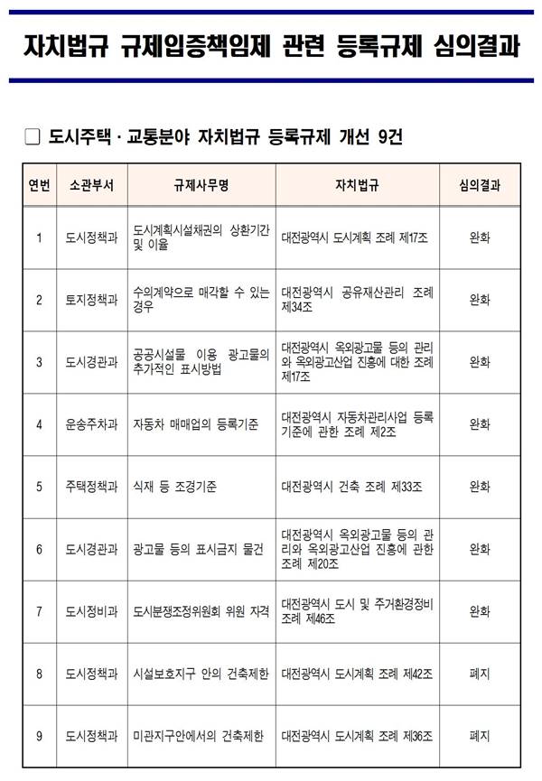 À̳¯ ȸÀÇ¿¡´Â ´ëÀü½Ã ÀÚÄ¡¹ý±Ô µî·Ï±ÔÁ¦ 155°Ç Áß µµ½ÃÁÖÅÃ․±³Åë ºÐ¾ß 79°ÇÀÇ ±ÔÁ¦¸¦ ´ë»óÀ¸·Î ¼Ò°üºÎ¼¿¡¼ ±ÔÁ¦Á¸Ä¡ ¶Ç´Â °³¼± Çʿ伺 µî¿¡ ´ëÇØ 1Â÷ °ËÅ並 ½Ç½ÃÇϰí, ±ÔÁ¦ÃѰýºÎ¼(¹ý¹«´ã´ç°ü)¿¡¼ ±ÔÁ¦ÀÇ ÀûÁ¤¼º․Ÿ´ç¼º µî¿¡ ´ëÇØ 2Â÷ °ËÅ並 °ÅÃÄ ±ÔÁ¦Á¸Ä¡ ÀÔÁõÀÌ ÇÊ¿äÇÏ´Ù°í ÆÇ´ÜÇÑ ±ÔÁ¦°¡ ½ÉÀǾȰÇÀ¸·Î »óÁ¤µÆ´Ù.