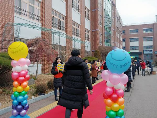 Áö³­ 6ÀÏ ¿ÀÀü, ±ºÆ÷½Ã ±Ã³»µ¿ Áö¿ª»çȸº¸ÀåÇùÀÇü ¡®Âü»ç¶û¡¯ À§¿øµé°ú »êº»°ø¾÷°íµîÇб³(ÀÌÇÏ »êº»°ø°í) ±³»çµéÀº Çб³ ±³¹® ¾Õ¿¡ »¡°£ ·¹µåÄ«ÆêÀ» ±ò°í, Àü±³»ý 280¸íºÐÀÇ ¾ÆÄ§¹ä°ú µû¶æÇÑ Â÷¸¦ ÁغñÇÑ Ã¤ µî±³ÇÏ´Â ÇлýµéÀ» ¸ÂÀÌÇß´Ù.