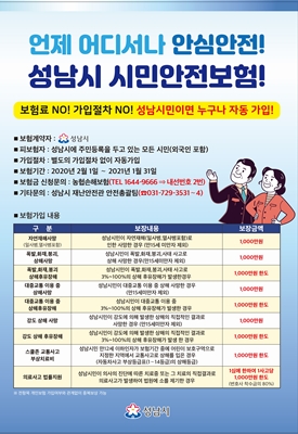 ½Ã¹Î¾ÈÀüº¸ÇèÀº ÀÏ»ó»ýȰ¿¡¼ ¿¹»óÄ¡ ¸øÇÑ Àç³À̳ª ¾ÈÀü»ç°í¸¦ ´çÇßÀ» ¶§ ¼º³²½Ã¿Í °è¾àÇÑ º¸Çè»ç¸¦ ÅëÇØ ÃÖ´ë 1000¸¸¿ø ÇѵµÀÇ º¸Çè±ÝÀ» Áö±ÞÇÏ´Â Á¦µµ´Ù. ¼º³²½Ã¿¡ Áֹεî·ÏÀ» µÐ ½Ã¹Î(¿Ü±¹ÀÎ Æ÷ÇÔ)ÀÌ¸é º°µµ ÀýÂ÷ ¾øÀÌ ÀÚµ¿ °¡ÀԵȴÙ.