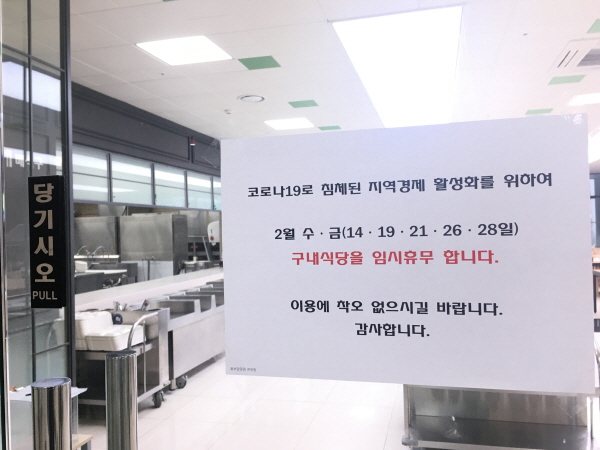 ¶Ç ¼Òºñ½É¸®°¡ À§ÃàµÇ¸é¼­ ¸ÅÃâÀÌ Ç϶ô µî ¿µÇâÀ» Á÷Á¢ÀûÀ¸·Î ¹Þ´Â °ü³» »óÀε鵵 ÀÀ¿øÇÑ´Ù. ¿ì¼± ½ÃÈï½ÃûÀº ¿À´Â 14ÀϺÎÅÍ 2¿ù ÇÑ ´Þ°£ ¼ö¿äÀϰú ±Ý¿äÀÏ ±¸³»½Ä´çÀ» ¿î¿µÇÏÁö ¾Ê´Â´Ù. ÀÌ ³¯À» Áö¿ª°æÁ¦ »ì¸®±â ³¯·Î »ï¾Æ ½Ãû °ø¹«¿øµéºÎÅÍ °ü³» ½Ä´ç¿¡¼­ Á¡½ÉÀ» ¸Ô°í, ƯÈ÷ ȸ½ÄÀ̳ª ¹°Ç° ±¸ÀÔÀº ´Ù¸¥ Áö¿ªº¸´Ù »ó´ëÀûÀ¸·Î ħüµÅ ÀÖ´Â È®ÁøÈ¯ÀÚ ¹ß»ýÁö¿ªÀÇ »óÁ¡À» ÀÌ¿ëÇϱâ·Î Çß´Ù. ÇöÀç ½ÃÈï½Ãû ±¸³»½Ä´çÀº Á¡½É ±âÁØ 1ÀÏ Æò±Õ 625¸íÀÌ ÀÌ¿ëÇϰí ÀÖ´Ù.