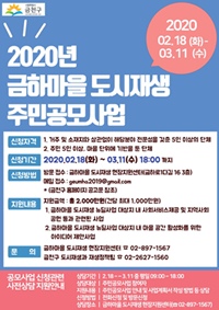 ±Ýõ±¸(±¸Ã»Àå À¯¼ºÈÆ)°¡ µ¶»ê1µ¿ ±ÝÇϸ¶À»(µ¶»ê1µ¿ 1100¹øÁö ÀÏ´ë) µµ½ÃÀç»ý ´ºµô»ç¾÷¿¡ ´ëÇÑ Áö¿ª ÁÖ¹ÎÀÇ °ü½É°ú Âü¿©¸¦ ³ôÀ̰í, ÁֹεéÀÇ Âü½ÅÇÑ ¾ÆÀ̵ð¾î¸¦ ¹ß±¼Çϱâ À§ÇØ ¿À´Â 3¿ù 11ÀÏ(¼ö)±îÁö ¡®2020³â ±ÝÇϸ¶À» µµ½ÃÀç»ý Áֹΰø¸ð»ç¾÷¡¯À» ½Ç½ÃÇÑ´Ù°í ÀüÇß´Ù.