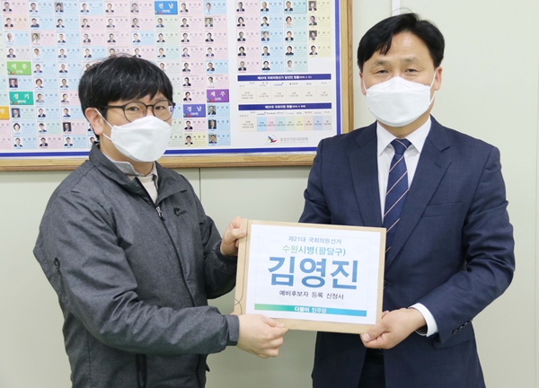 ´õºÒ¾î¹ÎÁÖ´ç ±è¿µÁø ±¹È¸ÀÇ¿ø(¼ö¿ø½Ãº´, ÆÈ´Þ±¸)Àº 27ÀÏ(¸ñ) °æ±âµµ ¼ö¿ø½Ã ÆÈ´Þ±¸ ¼±°Å°ü¸®À§¿øÈ¸¿¡¼ ¿À´Â 4¿ù 15ÀÏ¿¡ Ä¡·¯Áú Á¦21´ë ±¹È¸ÀÇ¿ø ¼±°ÅÀÇ ¿¹ºñÈĺ¸ µî·ÏÀ» ¸¶Ä¡°í º»°ÝÀûÀ¸·Î ÃѼ± ÀÏÁ¤¿¡ µ¹ÀÔÇß´Ù°í ÀüÇß´Ù.