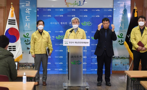 °û»ó¿í ¿À»ê½ÃÀåÀº Äڷγª19 È®ÁøÀÚ ¹ß»ý¿¡ µû¶ó 29ÀÏ ½Ãû ¹°Çâ±â½Ç¿¡¼­ ±ä±Þ ±âÀÚȸ°ßÀ» ¿­°í, Áö¿ª»çȸ °¨¿°ÀüÆÄ ¹× È®»ê ¹æÁö¸¦ À§ÇÑ Á¶Ä¡»óȲ°ú ´ëÀÀ°èȹÀ» ¹ßÇ¥Çß´Ù.