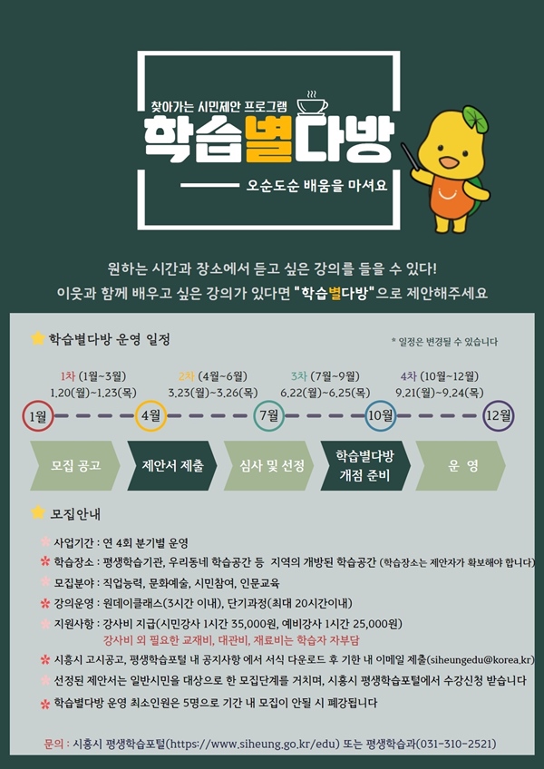 ÇнÀº°´Ù¹æÀº ½ÃÈï½Ã¹Î ¶Ç´Â ½ÃÈï½Ã ¼ÒÀç »ç¾÷Àå, ÀçÁ÷ÀÚ ´©±¸³ª Á¦¾È°¡´ÉÇÏ¸ç Æò»ýÇнÀ±â°ü, ¿ì¸®µ¿³× ÇнÀ°ø°£ µî Áö¿ªÀÇ °³¹æµÈ ÇнÀ°ø°£¿¡¼­ ±âÃʹ®Çر³À°, Çзº¸¿Ï±³À°À» Á¦¿ÜÇÑ ³»¿ëÀ¸·Î ÃÖ´ë 20½Ã°£ À̳» ±¸¼ºÇÒ ¼ö ÀÖ´Ù.