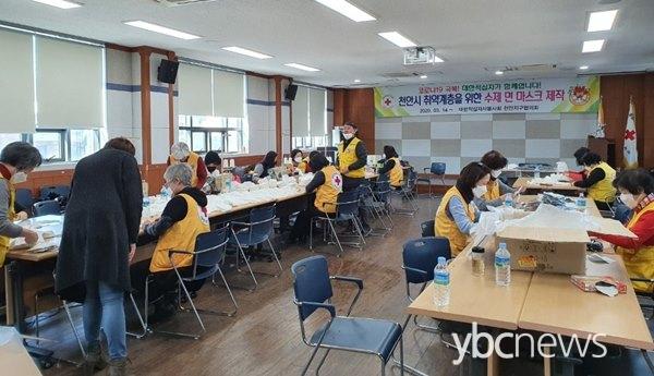 ´ëÇÑÀû½ÊÀÚºÀ»çȸ õ¾ÈÁö±¸ÇùÀÇȸ ȸ¿øµéÀÌ ¼öÁ¦ ¸¶½ºÅ©¸¦ Á¦ÀÛÇϰí ÀÖ´Ù.