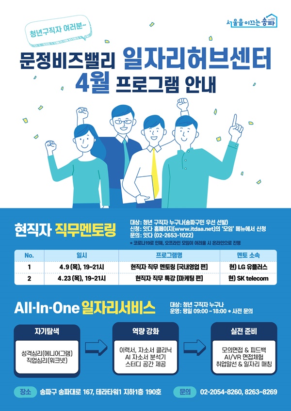 À̹ۿ¡µµ ¼ÛÆÄ±¸ ¹®Á¤ºñÁî¹ë¸® ÀÏÀÚ¸®Çãºê¼¾ÅÍ¿¡¼­´Â ¡®¿ÃÀοø ÀÏÀÚ¸®¼­ºñ½º¡¯¸¦ »ó½Ã ¿î¿µÇϰí ÀÖ´Ù. ¡â¼º°Ý½É¸®¡¤Á÷¾÷½É¸® °Ë»ç ¡âÀü¹® »ó´ã»ç¿Í ÇÔ²²ÇÏ´Â À̷¼­¡¤ÀÚ±â¼Ò°³¼­ Ŭ¸®´Ð ¡âAI¡¤VR ¸éÁ¢Ã¼Çè ¡âÃë¾÷¾Ë¼±¡¤ÀÏÀÚ¸® ¸ÅĪ µî ÇÁ·Î±×·¥À¸·Î û³â ±¸Á÷ÀÚ¸¦ Áö¿øÇÑ´Ù.