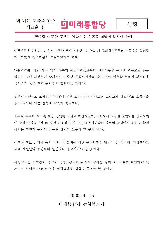¹Ì·¡ÅëÇÕ´ç ÃæºÏµµ´çÀº 15ÀÏ ¼º¸í¼­¸¦ ³»°í ¹ÎÁÖ´ç ÀÌÈÄ»ï È帴 ³ú¹°¼ö¼ö ÀÇȤÀ» ³¹³¹ÀÌ ¹àÇô¾ß ÇÑ´Ù°í ¹àÇû´Ù.