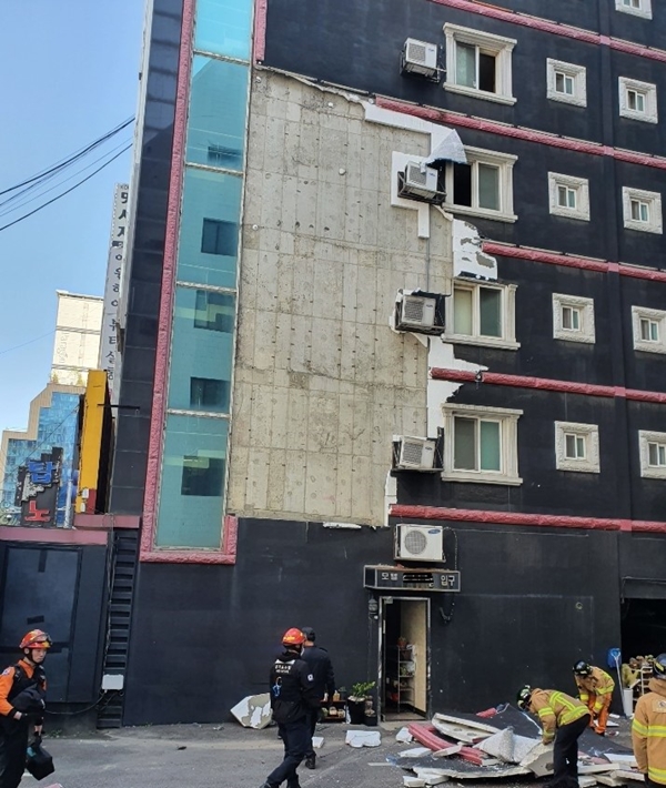 °Ç¹° ¿Üº®ÀÌ ¶â¾îÁö°í, ÆÄÀÌÇÁ°¡ ºÎ¼­Á³À¸¸ç, ¿ÀÈÄ 2½Ã32ºÐ°æ ÆÈ´Þ±¸ Àΰ赿 ¸ðÅÚ 6Ãþ °Ç¹°¿¡¼­ 2~4Ãþ ¿Üº®ÀÇ µå¶óÀ̺ñÆ® ±¸Á¶ º®¸éÀÌ ¹Ù¶÷¿¡ ³¯·Á ´ú··°Å¸®¸ç ¶³¾îÁö·Á´Â »ç°í°¡ ¹ß»ýÇß´Ù. ÀÌ¿¡ ´ë¿øµéÀº ¾ÈÀüÁ¶Ä¡ ÈÄ 30¿© ºÐ µ¿¾È ¿ÜÀåÀ縦 Á¦°ÅÇÏ´Â ÀÛ¾÷À» ¹ú¿´´Ù.