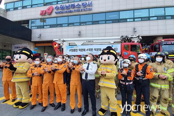 ¼ö¿ø³²ºÎ¼Ò¹æ¼´Â 29ÀÏ ¿ÀÀü ¼Ò¹æ¼ û»ç ¾Õ¿¡¼ Äڷγª19 ´ëÀÀ¿¡ Çå½ÅÇϰí ÀÖ´Â Àü±¹ ÀÇ·áÁøµé¿¡°Ô °¨»çÀÇ ¸¶À½À» ÀüÇϱâ À§ÇØ ´ë±¹¹Î ÀÀ¿ø Ä·ÆäÀÎ ¡®´öºÐ¿¡ 縰Áö¡¯¿¡ µ¿ÂüÇß´Ù°í ¹àÇû´Ù.