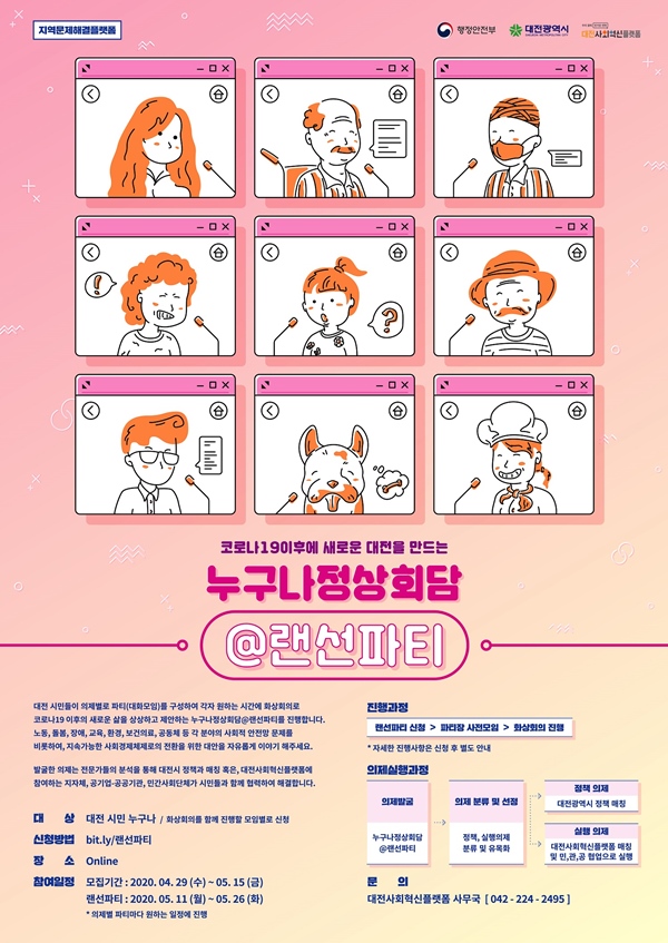 Äڷγª19 ÀÌÈÄÀÇ »õ·Î¿î ´ëÀüÀ» ¸¸µå´Â ¡®´©±¸³ªÁ¤»óȸ´ã@·£¼±ÆÄƼ¡¯ÆÄƼ¿ø ¸ðÁýÀº 4¿ù 29ÀϺÎÅÍ 5¿ù 15ÀϱîÁö ´ëÀü ½Ã¹Î ´©±¸³ª ¿Â¶óÀΰú Àüȸ¦ ÅëÇØ ½ÅûÇÒ ¼ö ÀÖ´Ù.