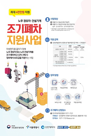ÇϹݱâ Á¶±â ÆóÂ÷ ½ÅûÀº Áö³ 6¿ù 1ÀϺÎÅÍ ¼±Âø¼øÀ¸·Î Á¢¼ö ÁßÀÌ´Ù. Áö¿ø´ë»óÀº ¹èÃâ°¡½º 5µî±Þ °æÀ¯Â÷·Î ÀÚµ¿Â÷°ü¸®¹ý¿¡ µû¶ó °ü´É°Ë»ç °á°ú ÀûÇÕÆÇÁ¤À» ¹Þ°í, ½ÃÈï½Ã¿¡ µî·ÏµÈ Â÷·® Áß ½ÅûÀÏ ÀÌÀü 6°³¿ù ÀÌ»ó ¿¬¼ÓÀ¸·Î ´ë±â°ü¸®±Ç¿ª(¼¿ï¡¤ÀÎõ¡¤°æ±âµµ)¿¡ µî·ÏµÈ Â÷·® µîÀÌ ÇØ´çµÈ´Ù. Á¶±â ÆóÂ÷ °ü·Ã »ó¼¼ ÀÚ°Ý Á¶°Ç°ú ½Åû ÀýÂ÷ µîÀº Áö¿ø½Åû¼ Á¢¼ö¸¦ ÁÖ°üÇÏ´Â Çѱ¹ÀÚµ¿Â÷ȯ°æÇùȸ(1577-7121)¿¡ ¹®ÀÇÇÏ¸é µÈ´Ù.