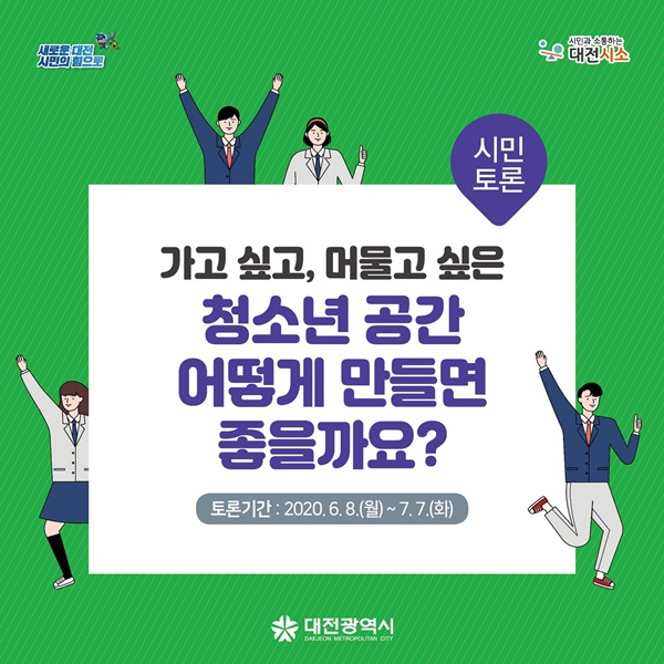 ´ëÀü½Ã´Â 8ÀϺÎÅÍ ³»´Þ 7ÀϱîÁö ½Ã¹ÎÂü¿© Ç÷§Æû ´ëÀü½Ã¼Ò(daejeon.go.kr/seesaw)¿¡¼­ ¡®°¡°í ½Í°í, ¸Ó¹°°í ½ÍÀº û¼Ò³â °ø°£ ¾î¶»°Ô ¸¸µé¸é ÁÁÀ»±î¿ä?¡¯¸¦ ÁÖÁ¦·Î ¿Â¶óÀÎ °ø·ÐÀåÀ» ¿¬´Ù°í ¹àÇû´Ù.
