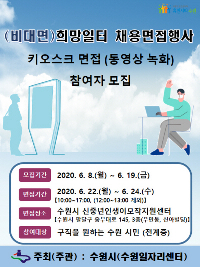 ÀÌÈÄ 22~24ÀÏ Áß ÁöÁ¤µÈ ½Ã°£¿¡ ¼ö¿ø½Ã ÀλýÀ̸ðÀÛÁö¿ø¼¾ÅÍ(¼ö¿ø½Ã ÆÈ´Þ±¸ Áߺδë·Î 145, ½Å¾Æºôµù 3Ãþ)¿¡ ¼³Ä¡µÈ Ű¿À½ºÅ©¸¦ ÅëÇØ ¸éÁ¢ µ¿¿µ»óÀ» ÃÔ¿µÇÏ°Ô µÈ´Ù.