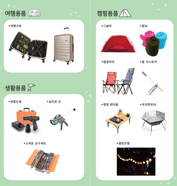 °øÀ¯¹°Ç° ´ë¿©¼ºñ½º ǰ¸ñÀº ¿©Çà¿ë°¡¹æ, ±×´Ã¸·ÅÙÆ®(¸ÅÆ®Æ÷ÇÔ), ħ³¶, Ä·ÇÎÅ×ÀÌºí ¹× ÀÇÀÚ, À°°¢È·Î´ë, ¿À´öÅ×À̺í, ·Õ°¡½ºÅäÄ¡, Ä·ÇÎÁ¶¸í, Àüµ¿µå¸±, °ø±¸¼¼Æ® µîÀÌ¸ç ´ë¿©±â°£Àº ÃÖ´ë 20ÀÏÀÌ´Ù.