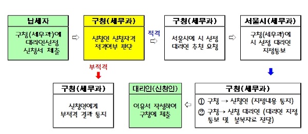 ½Åû¹æ¹ýÀº ³³¼¼ÀÚ°¡ ±¸Ã» ¼¼¹«°ú¿¡ ÀÌÀǽÅû¼, ´ë¸®ÀÎ ¼±Á¤ ½Åû¼ µîÀ» Á¦ÃâÇÏ¸é ³³¼¼ÀÚÀÇ ¼Òµæ°ú Àç»ê¿ä°Ç µîÀ» °ËÅäÇÑ ÈÄ Á¢¼öÀϷκÎÅÍ 7ÀÏ À̳»¿¡ ´ë¸®ÀÎÀ» ÁöÁ¤ÇØ ÁÖ´Â ¹æ½ÄÀ¸·Î ¿î¿µµÈ´Ù.