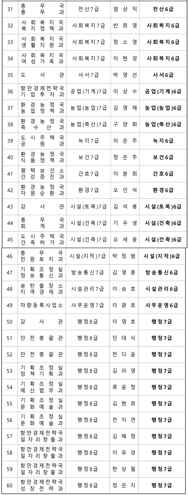 ¢º 7±Þ¡æ6±Þ : 40¸í[ÇàÁ¤ 20, ¼¼¹« 1, Àü»ê 1, »çȸº¹Áö 3, »ç¼ 1, °ø¾÷(±â°è) 1, ³ó¾÷(ÀϹݳó¾÷) 1, ³ó¾÷(Ãà»ê) 1, ³ìÁö 1, º¸°Ç 1, °£È£ 1, ȯ°æ 1, ½Ã¼³(Åä¸ñ) 1, ½Ã¼³(°ÇÃà) 2, ½Ã¼³(ÁöÀû) 1, ¹æ¼ÛÅë½Å 1, ½Ã¼³°ü¸® 1, »ç¹«¿î¿µ(Àü»ê¿î¿µ) 1]