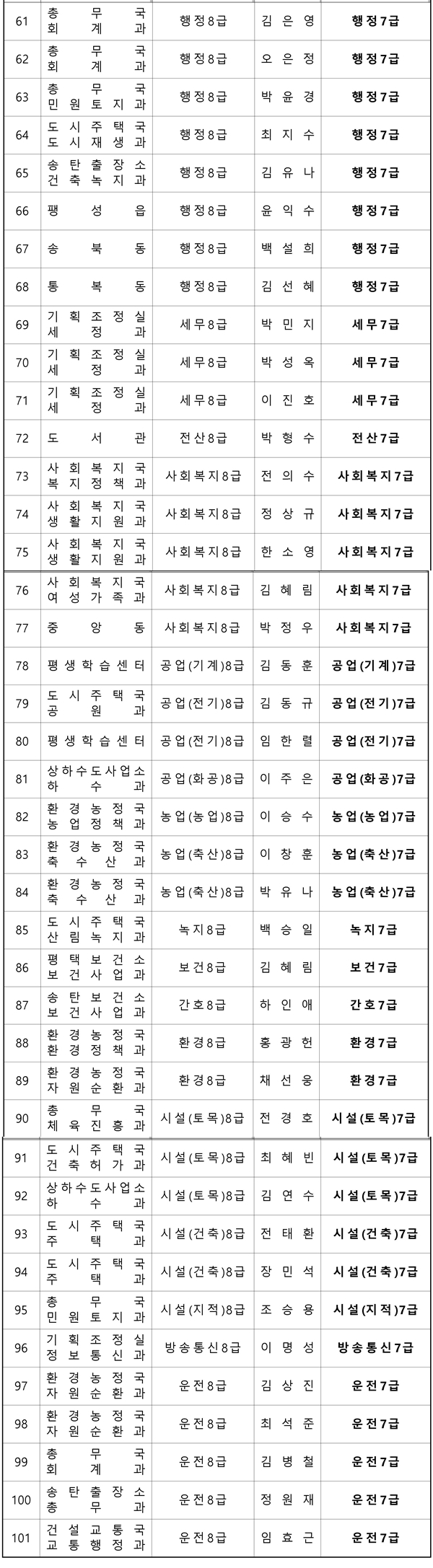 ¢º 9±Þ¡æ8±Þ : 63¸í[ÇàÁ¤ 29, ¼¼¹« 2, »çȸº¹Áö 7, »ç¼ 2, °ø¾÷(Àü±â) 1, ³ó¾÷(ÀϹݳó¾÷) 1, ³ìÁö(Á¶°æ) 2, º¸°Ç 2, ÀÇ·á±â¼ú 4, ȯ°æ 1, ½Ã¼³(Åä¸ñ) 2, ½Ã¼³(°ÇÃà) 5, ½Ã¼³(ÁöÀû) 1, ¹æÀç¾ÈÀü 1, ¹æ¼ÛÅë½Å 1, ¿îÀü 2]