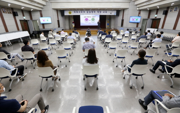 À̳¯ ¿ÀÈÄ ÀÇȸ»ç¹«Ã³ 1Ãþ ´ëȸÀǽǿ¡¼ ¡®°©¡¤À»¿¡¼ µ¿ÇàÀ¸·Î¡¯¶ó´Â ÁÖÁ¦·Î 2½Ã°£ µ¿¾È ÁøÇàµÈ °¿¬¿¡´Â ÀÇȸ»ç¹«Ã³ Á÷¿ø 50¿© ¸íÀÌ Âü¼®Çß°í, Âü¼® Á÷¿ø Àü¿øÀº ü¿ÂÀ» ÃøÁ¤ÇÑ µÚ ¸¶½ºÅ©¸¦ Âø¿ëÇϰí, »çȸÀû °Å¸®µÎ±â¸¦ À¯ÁöÇÏ´Â µî Äڷγª19 È®»ê ¹æÁö¿¡ ¸¸ÀüÀ» ±âÇÏ¸ç °¿¬À» ûÃëÇß´Ù.