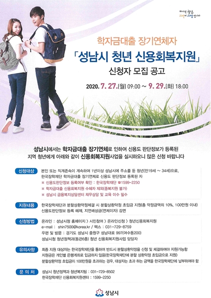 ¼º³²½Ã´Â ÇÐÀÚ±Ý ´ëÃâÀ» °±Áö ¸øÇØ À̸¥¹Ù ¡®½Å¿ëºÒ·®ÀÚ¡¯°¡ µÈ û³âÀÇ ½Å¿ëȸº¹À» Áö¿øÇϱâ À§ÇØ ¿À´Â 7¿ù 27ÀϺÎÅÍ 9¿ù 29ÀϱîÁö ´ë»óÀÚ¸¦ ¸ðÁýÇÑ´Ù.