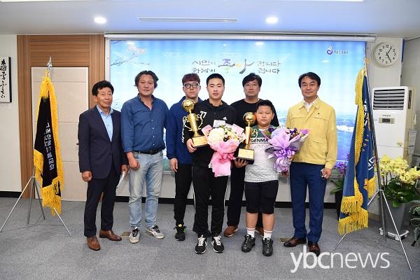 À̳¯ ±è»óÈ£ ½ÃÀåÀº ±¸º»Ã¤ Çϳ²½ÃüÀ°È¸Àå°ú ÇÔ²² µ¿ºÎÃÊ ±èº´ÁØ ¼±¼ö, ³²ÇÑÁß ¹Ú¹üȯ ¼±¼ö¸¦ ºñ·ÔÇÑ °¨µ¶, ÄÚÄ¡ µî 6¸íÀ» ÃÊÃ»ÇØ ¿ì½Â Æ®·ÎÇÇ¿Í ²É´Ù¹ßÀ» Àü´ÞÇß´Ù.