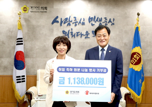 ÀåÇö±¹ °æ±âµµÀÇȸ ÀÇÀå(´õ¹ÎÁÖ, ¼ö¿ø7)ÀÌ 27ÀÏ ¾Æµ¿ÈÄ¿ø´Üü¿¡ ÃëÀÓÃàÇÏ È­ºÐ ÆÇ¸Å·Î °ÅµÐ ¼öÀͱÝÀ» Àü¾× Àü´ÞÇÏ°í ¡°Àϻ󿡼­ ¡®³ª´®ÀÇ ¼±¼øÈ¯¡¯À» ½ÇÇöÇÏ´Â µµÀÇȸ¸¦ À̲ø¾î °¡°Ú´Ù¡±°í Æ÷ºÎ¸¦ ¹àÇû´Ù.