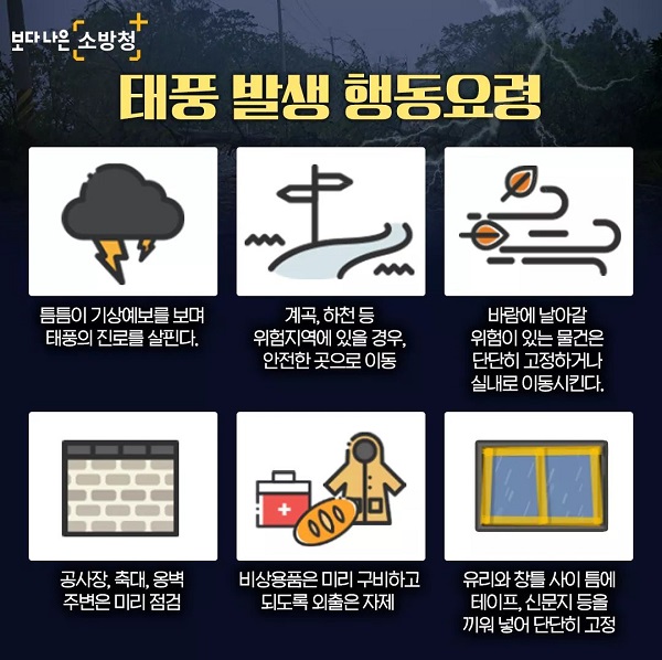 º¸¼º¼Ò¹æ¼(¼Àå Á¤´ë¿ø)´Â ÅÂdzÀ¸·Î ÀÎÇÑ °Ç³°ú ÁýÁßÈ£¿ì·Î °¢Á¾ ¾ÈÀü»ç°í°¡ Áõ°¡ÇÒ °ÍÀ¸·Î ¿¹»óµÅ ÅÂdz ¹ß»ý Çൿ¿ä·ÉÀ» È«º¸ÇÏ°í ³ª¼¹´Ù.