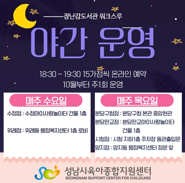 ¼º³²½Ã´Â ¾ÆÀÌ»ç¶û³îÀÌÅÍ Àå³­°¨µµ¼­°üÀÌ ÁÖ 1ȸ ¾ß°£ ´ë¿© ¼­ºñ½º¸¦ ÁøÇàÇÑ´Ù.