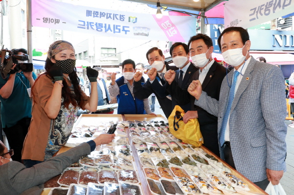 ÀÇ¿øµéÀº ¸ÕÀú Á¡Æ÷¼ö 388°³, »óÀÎ 919¸í ±Ô¸ðÀÇ ÀüÅë½ÃÀåÀ» µÑ·¯º¸¸ç ¿Â´©¸® »óǰ±ÇÀ¸·Î Á¤À°, ¶±, °Ç¾î¹°, °úÀÏ, °Á¤ µî ¸íÀý ¸Ô°Å¸®¸¦ ±¸ÀÔÇϰí, ½ÃÀå »óÀÎȸ¿¡¼ ¾÷Á¾º° »óÀεé°ú ¾È½Â³² ±¸¸®½ÃÀå, ÀÌÈ«¿ì °æ±â½ÃÀå»ó±ÇÁøÈï¿øÀå µî 20¿© ¸íÀÌ Âü¼®ÇÑ °¡¿îµ¥ Á¤´ãȸ¸¦ °¡Á® ¼Ò»ó°øÀÎ Áö¿øÈ®´ë ¹× ¡®°æ±âµµÇü °ø°ø¹è´Þ¾Û¡¯À» ÅëÇÑ Áö¿ªÈÆó Ȱ¿ë ±Ø´ëÈ ¹æ¾È µî¿¡ ´ëÇØ ³íÀÇÇß´Ù.