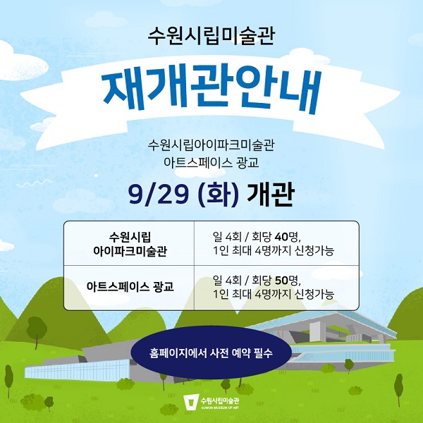°ü¶÷Àº ¼ö¿ø½Ã¸³¹Ì¼ú°ü ´©¸®Áý(http://suma.suwon.go.kr)À» ÅëÇØ ÀÏ 4ȸ, ¼ö¿ø½Ã¸³¾ÆÀÌÆÄÅ©¹Ì¼ú°ü ȸ´ç 40¸í, ¾ÆÆ®½ºÆäÀ̽º ±¤±³ ȸ´ç 50¸í¾¿ »çÀü ¿¹¾àÀÚ¿¡ ÇÑÇÏ¿© ÀÔÀå °¡´ÉÇϰí, »çÀü ¿¹¾àÀº 1ÀÎ ÃÖ´ë 4¸í¾¿ ½Åû °¡´ÉÇÏ¸ç ±³À° ÇÁ·Î±×·¥°ú ´Üü °ü¶÷Àº ¿î¿µµÇÁö ¾Ê´Â´Ù.