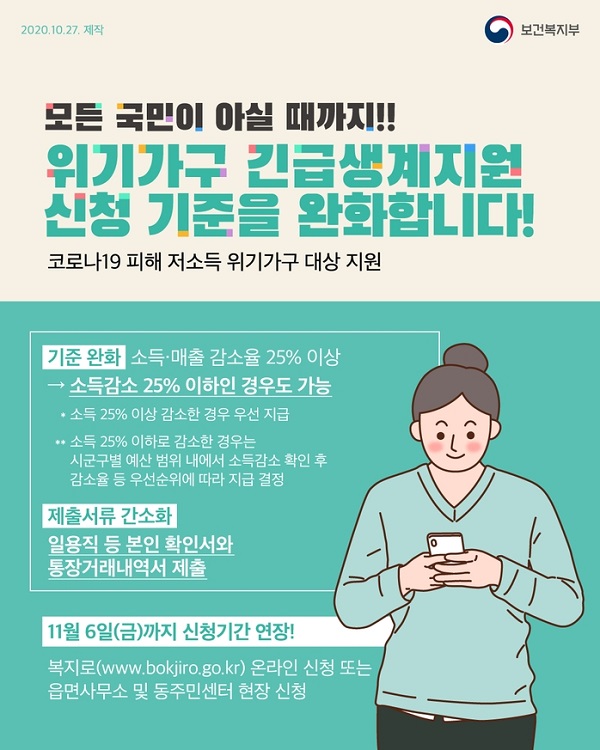 ¿ëÀνô 30ÀÏ ±âÁ¸ º¹ÁöÁ¦µµ³ª Äڷγª19 ÇÇÇØ Áö¿ø »ç¾÷ÀÇ ÇýÅÃÀ» ¹ÞÁö ¸øÇÑ Àú¼Òµæ À§±â°¡±¸¸¦ À§ÇÑ ±ä±Þ»ý°èÁö¿ø±Ý ½Åû±âÇ×À» 11¿ù 6ÀϱîÁö ¿¬ÀåÇÑ´Ù°í ¹àÇû´Ù.